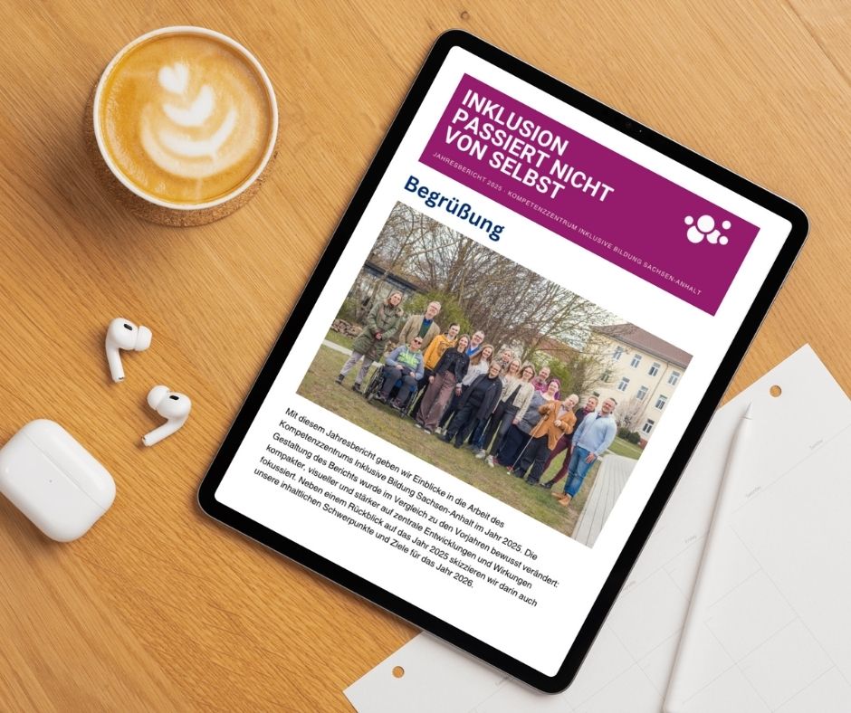 Der Jahresbericht 2025 des Kompetenzzentrums Inklusive Bildung Sachsen-Anhalt ist ab sofort verfügbar. Unter dem Leitmotiv „Inklusion passiert nicht von selbst“ gibt der Bericht Einblicke in unsere Arbeit, zentrale Entwicklungen und die Wirkung inklusiver Bildungsarbeit im vergangenen Jahr.